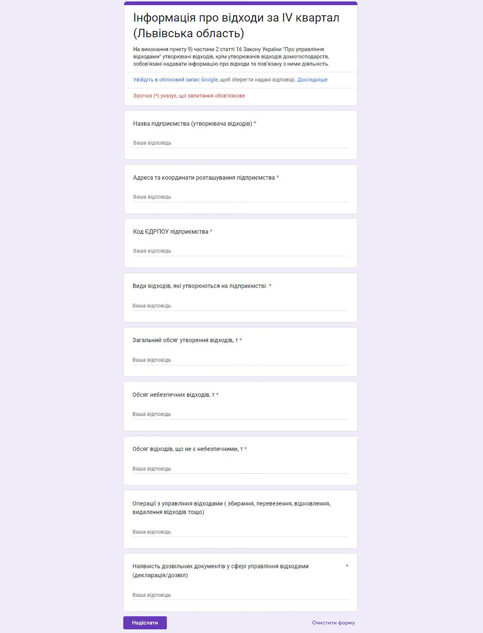 На сайті Департаменту екології та природних ресурсів Львівської ОДА опубліковано вимогу в термін до 15 січня 2025 року подати інформацію про утворення відходів та пов’язану з ними діяльність за ІV квартал 2024 року. Водночас наведено посилання на Google-форму, за допомогою якої суб’єкти господарювання повинні надати зазначену інформацію (рис. 1).