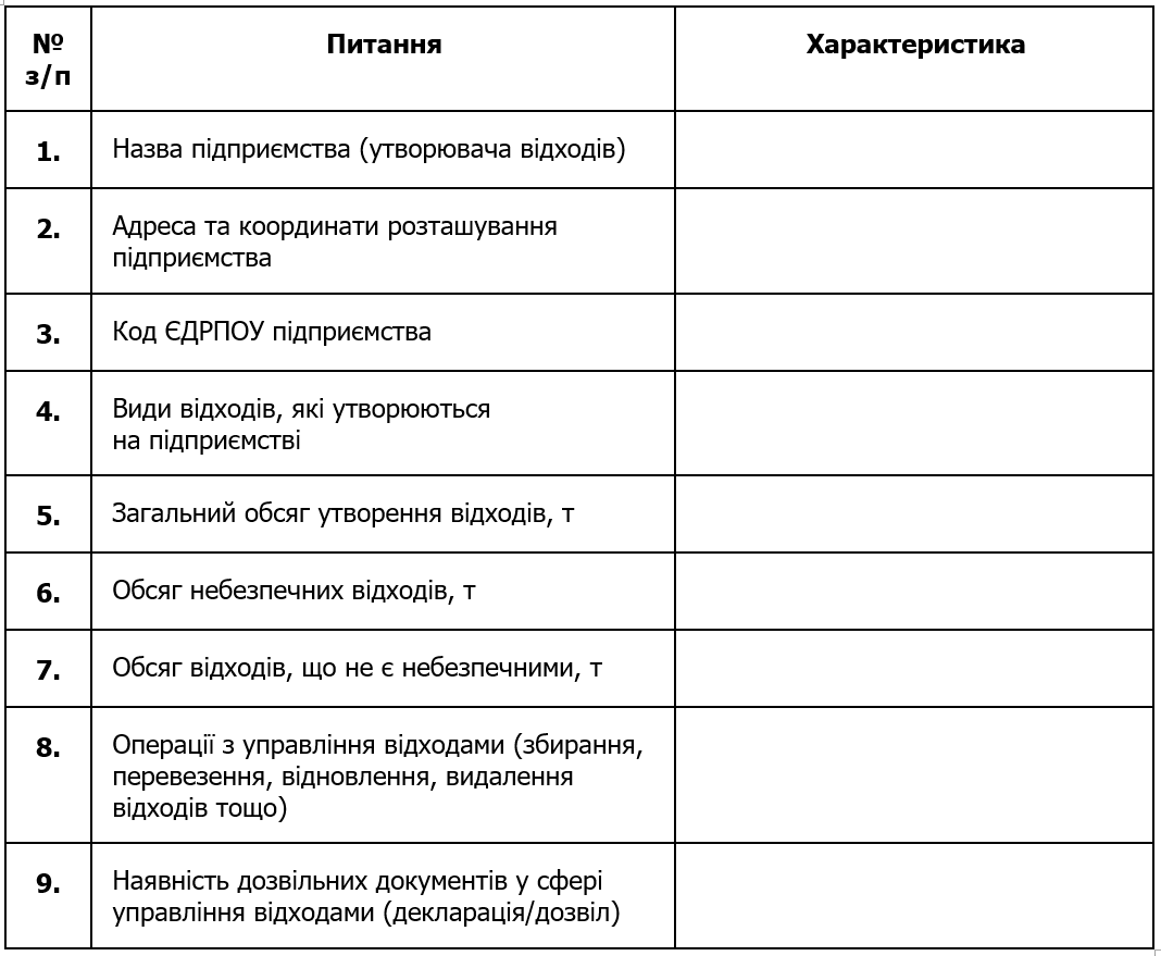 Варто зазначити, що надана структура документа «Інформація про відходи та пов’язану з ними діяльність» орієнтовна та не є вичерпною. У документ може бути включена та/або виключена певна інформація.